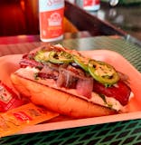 Niman Ranch beef hot dog, cream cheese, grilled onions, jalapenos on a garlic bread toasted potato bun.