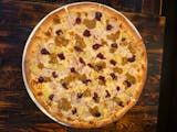 Pesto Sauce, Mozzarella Cheese, Chicken, Tomato, Red Onion, Banana Peppers, Garlic, Fresh Basil, Fresh Parmesan.