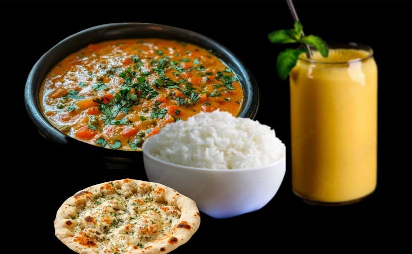 Mixed vegetables + Garlic Naan +Rice + Mango Lassi