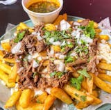 Crispy, golden homemade fries piled high with slow-braised, melt-in-your-mouth birria, smothered in rich, gooey cheese and finished with fresh cilantro and chopped onions. Served with a side of deeply spiced birria consommé to pour, dip, or drizzle—turning every bite into a bold, messy, unforgettable boardwalk-style indulgence