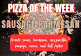 tomato sauce, parmesan, mozzarella, sausage, onion, and bell pepper