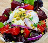 Fresh Ruby & Golden beets roasted, marinated in EVOO, honey & white balsamic served with Bermuda onion, Burrata & toasted pistachios over greens.