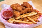 3 onion rings, 2 mozzarella sticks, 2 jalapeño poppers, 10 popcorn chicken, 3 zucchini sticks on a bed of fresh-cut french fries. Comes with marinara, ranch dressing, and ketchup.