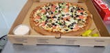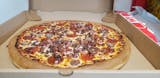 Pepperoni, sausage, beef, bell peppers, onions, mushrooms, olives, banana peppers, jalapenos, and ham.
