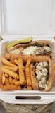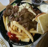 Gyro meat, French fries, pita bread, and a small Greek salad.