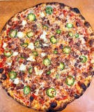 Smoked brisket, smoked bacon, smoked cream cheese and jalapeños all on top of our signature Plano Cheese Pizza